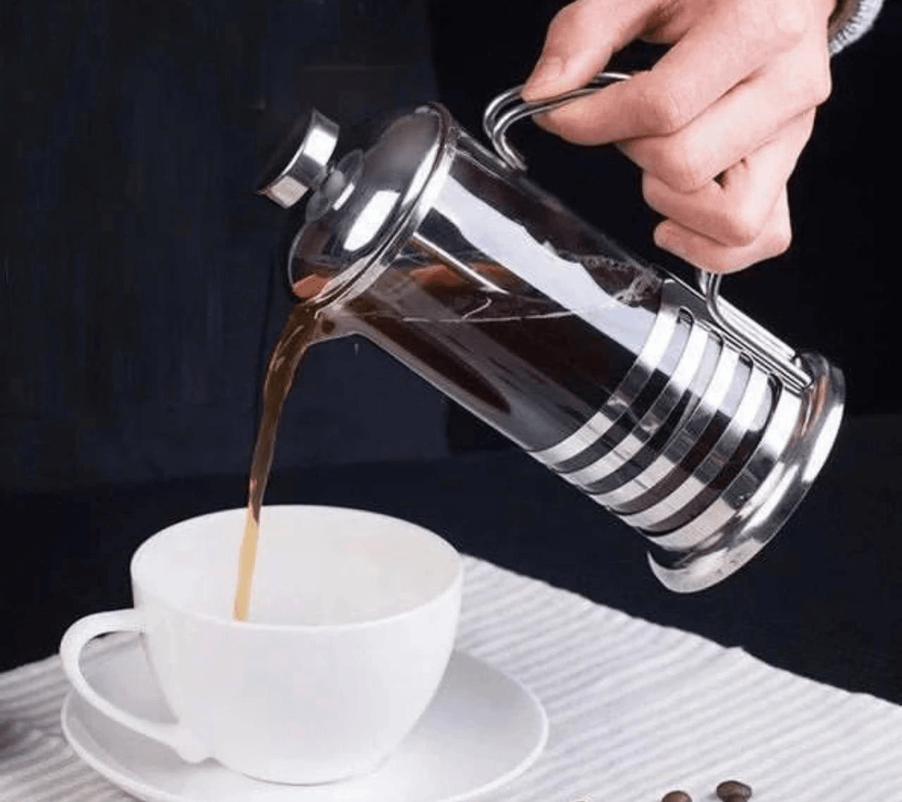۱) هنگامی که فرنچ پرس خشک و خالی از آب است ، دستگیره و توری دستگاه را از فرنچ پرس خارج کرده و سپس به ازای هر ۱۴۰ تا ۲۲۰ میلی لیتر آب ، یک قاشق غذاخوری قهوه فیلتری (قهوه فرانسه ) در فرنچ پرس بریزید . هرچه حجم آب نسبت به قهوه بیشتر باشد قهوه رقیق تر و ملایم تری خواهید داشت .
